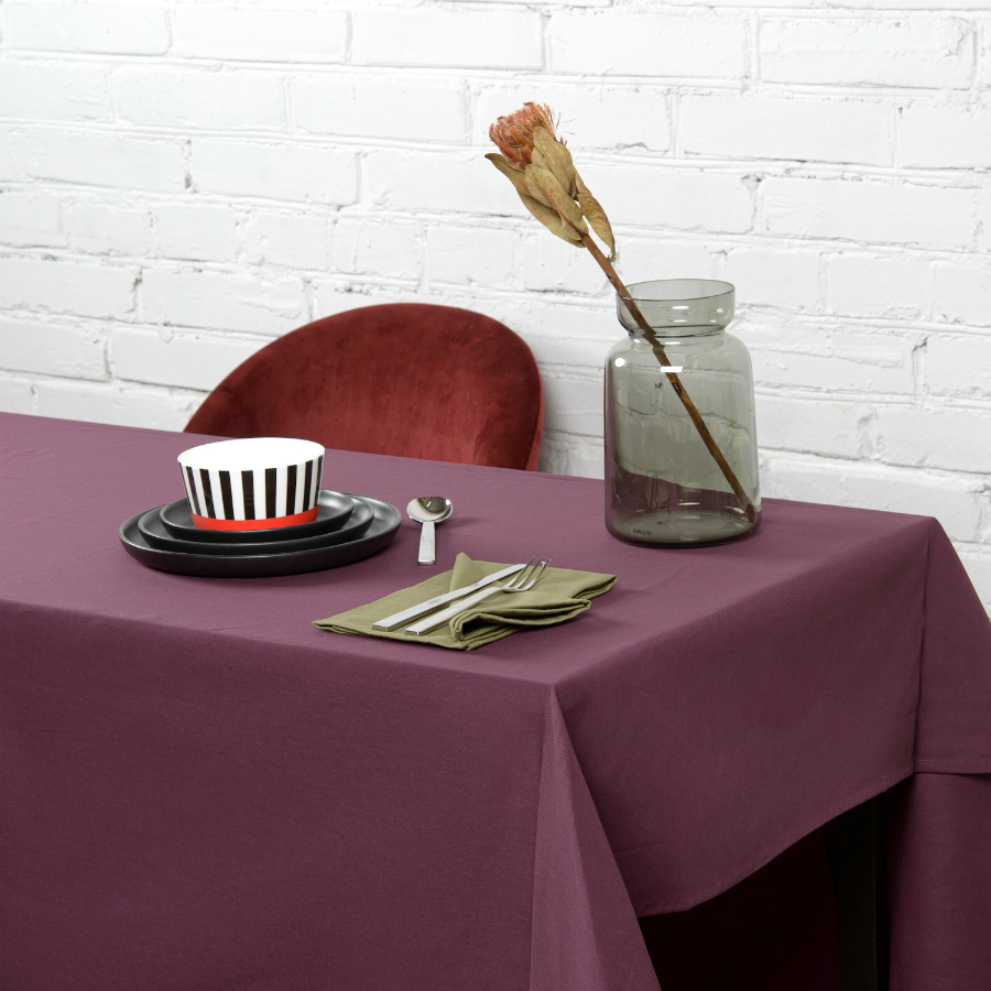 "Скатерть на стол представлена в насыщенном бордовом оттенке. Модель выполнена из плотного прочного хлопка. Приятный на ощупь материал не вызывает аллергических реакций, и на нем не образуются катышки.Тип плетения: твил. Плотность ткани - 215GSM.