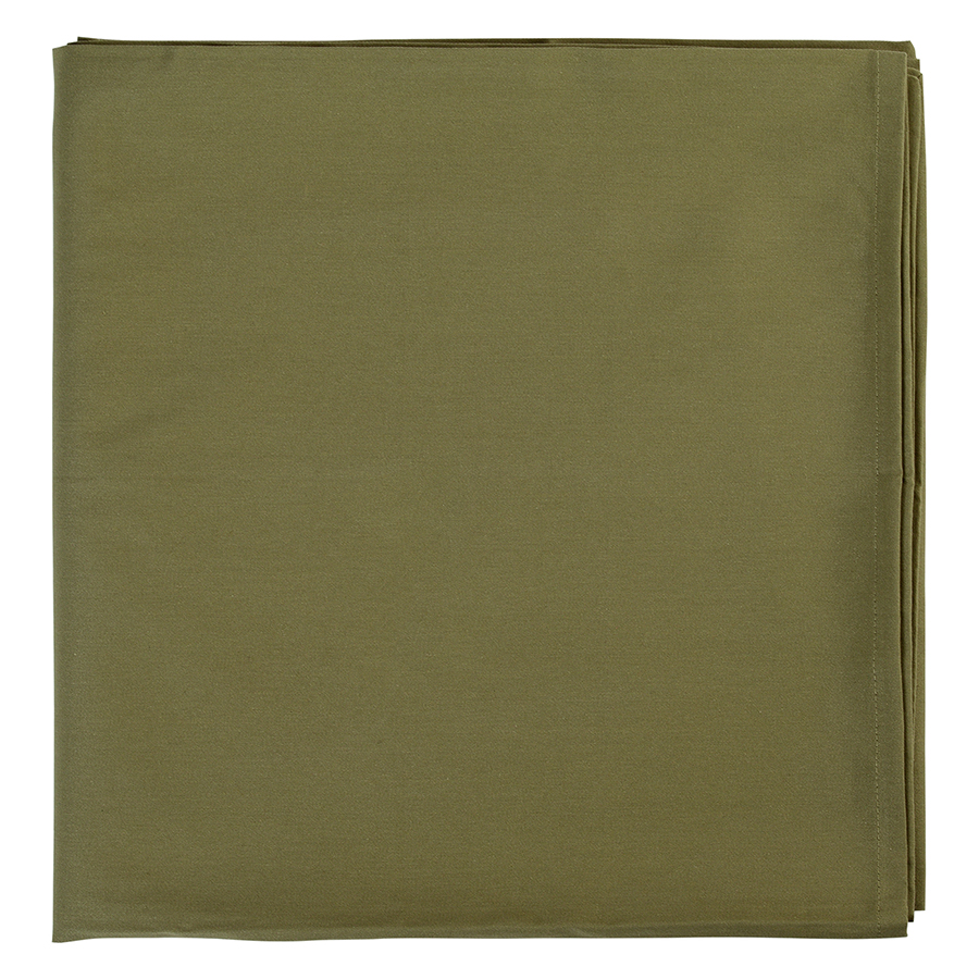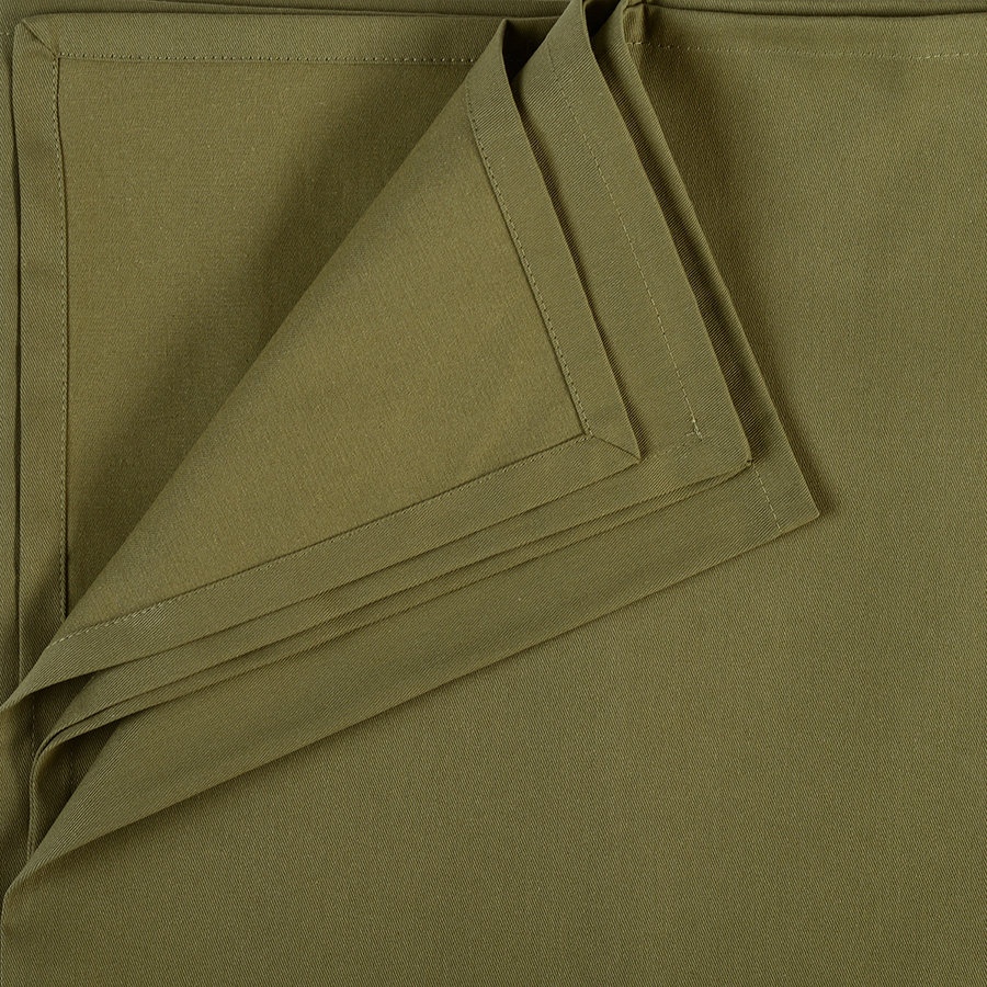 "Скатерть на стол представлена в насыщенном оливковом оттенке. Модель выполнена из плотного прочного хлопка. Приятный на ощупь материал не вызывает аллергических реакций, и на нем не образуются катышки.Тип плетения: твил. Плотность ткани - 215GSM.